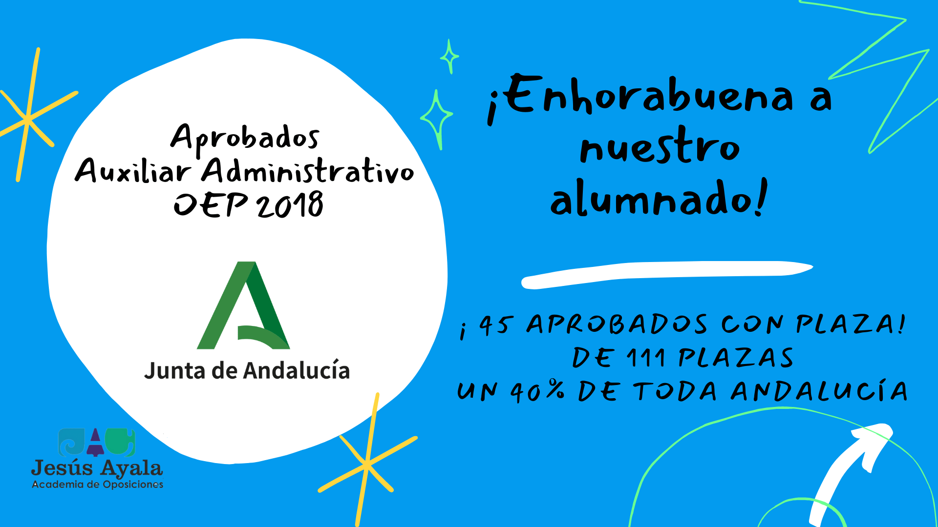 45 aprobados de Auxiliar Administrativo en Academia Jesús Ayala lo que hace un total del 40% plazas de toda Andalucía.