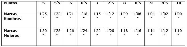 • Se agarre o impulse en las corcheras o en las calles laterales de la piscina.• Se agarre en los bordes de la piscina para descansar.• Se apoye o impulse en el fondo de la piscina.• Se cambie de calle.• No se toque la pared en el cambio de sentido.• Realice dos salidas nulas.• El tribunal de la oposición será asesorado por jueces de la Federación Andaluza de Natación que realizarán el control de los tiempos de la prueba con marcadores electrónicos.