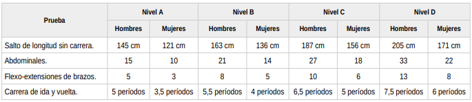 Para ser calificado apto en alguno de los niveles que se determinan, los aspirantes deberán alcanzar las marcas mínimas exigidas para cada una de las pruebas que se especifican en la siguiente tabla: